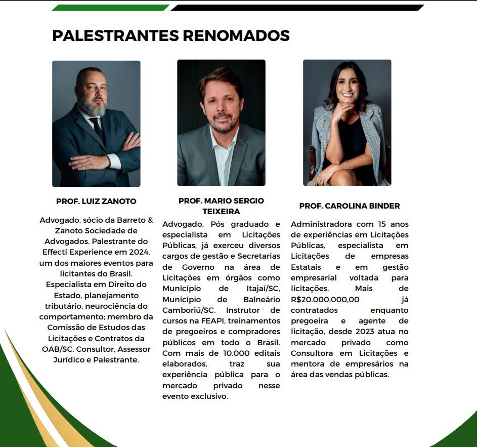 A condução da Imersão ficará por conta de três especialistas com anos de experiência prática em assessoria e mentoria e treinamentos em licitações públicas.